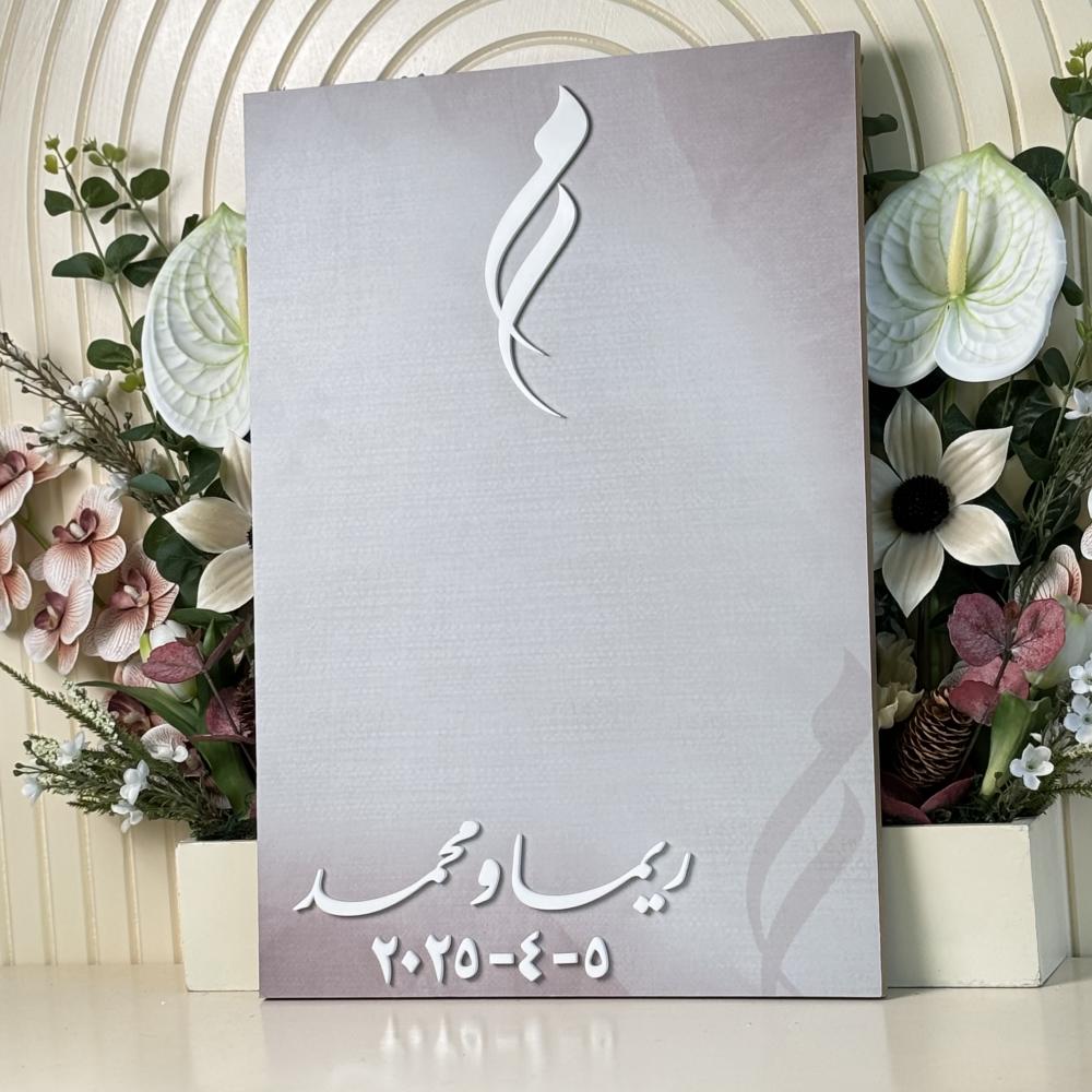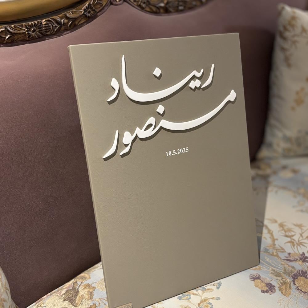 ✨ اجعل لحظات قرانك لا تُنسى مع لوحة عقد قران مميزة بـ أسماء/أحرف من الاكرليك الأبيض و بخلفية من الجلد الفاخر او طباعه ثيم اعلانك المميز .